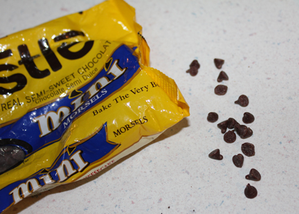 And mini chocolate chips for the eyes (you could use cloves, but chips sounded tastier to me!).