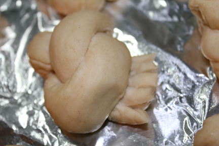 Pinch off golf ball sized pieces of dough and roll into ropes about 12 inches long. Fold each rope into a knot (just like tying your shoe) with one end up and one end down. The up end will be the bird’s head, the down end will be it’s tail.