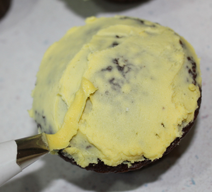 I started with a basic chocolate cupcake (you can make whatever flavor you like) then mixed up a bowl of buttercream frosting (see recipe below) and tinted it yellow.