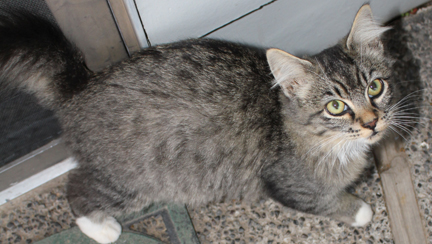 This is Flash. He’s the baby brother and quite probably the runt of the litter. When he first arrived on the scene he didn’t want anyone to see him, look at him, touch him or talk to him and that’s why we named him Flash. He’d take off like a little furry striped streak across the yard if he thought you might even think about getting close to him. He has since decided we have no intentions of eating him, beating him, or causing his demise. This little kitty loves to have his head and back rubbed and turns into a boneless mass of purring bliss whenever you rub him under the chin. Besides being such a sweet little guy, he has the most beautiful eyes.