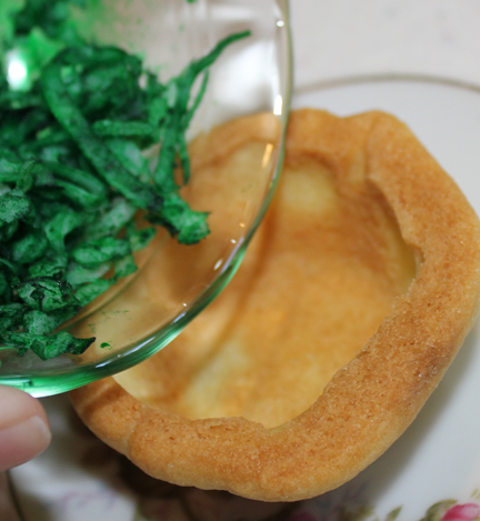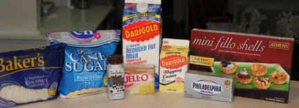 Fill mini tart shells. These came in a package of 12 – so you’d need four boxes. You can also use a graham cracker pie crust. Either way is tasty! Just fill tarts with filling and top with whipped cream.