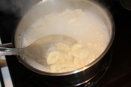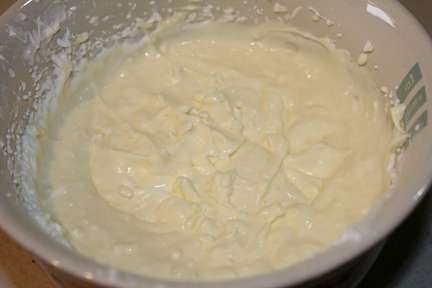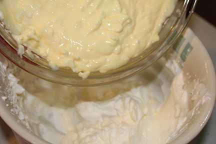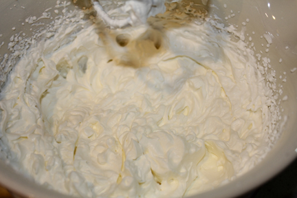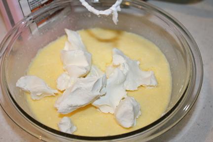 Use softened cream cheese (if you have a small package, great, if not, use half of a large package) and mix it into the pudding until thoroughly blended in medium speed. (You don’t want to beat the pudding to death). Set aside.