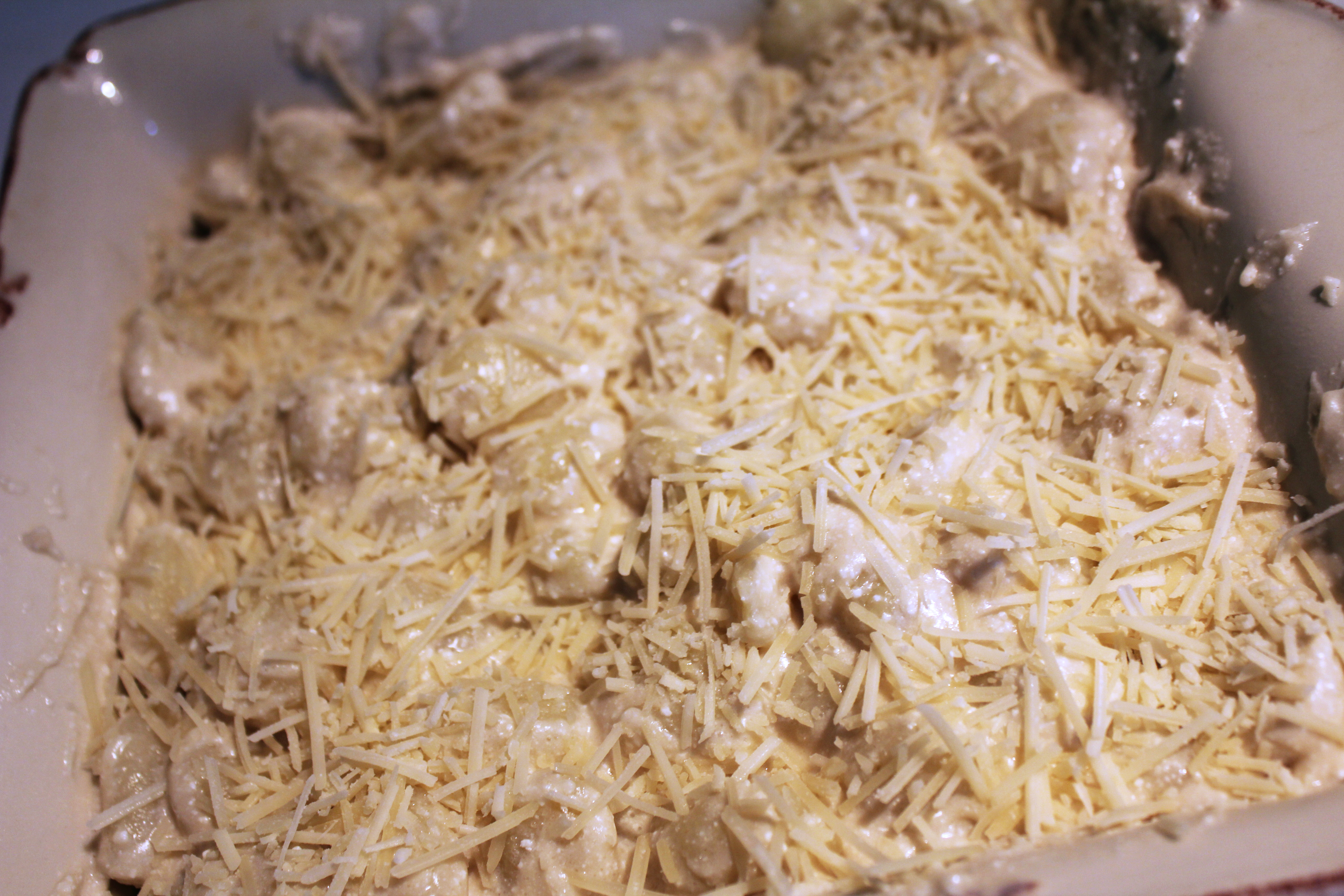 Cook your Gnocchi according to package directions, drain, and place into a shallow baking dish.