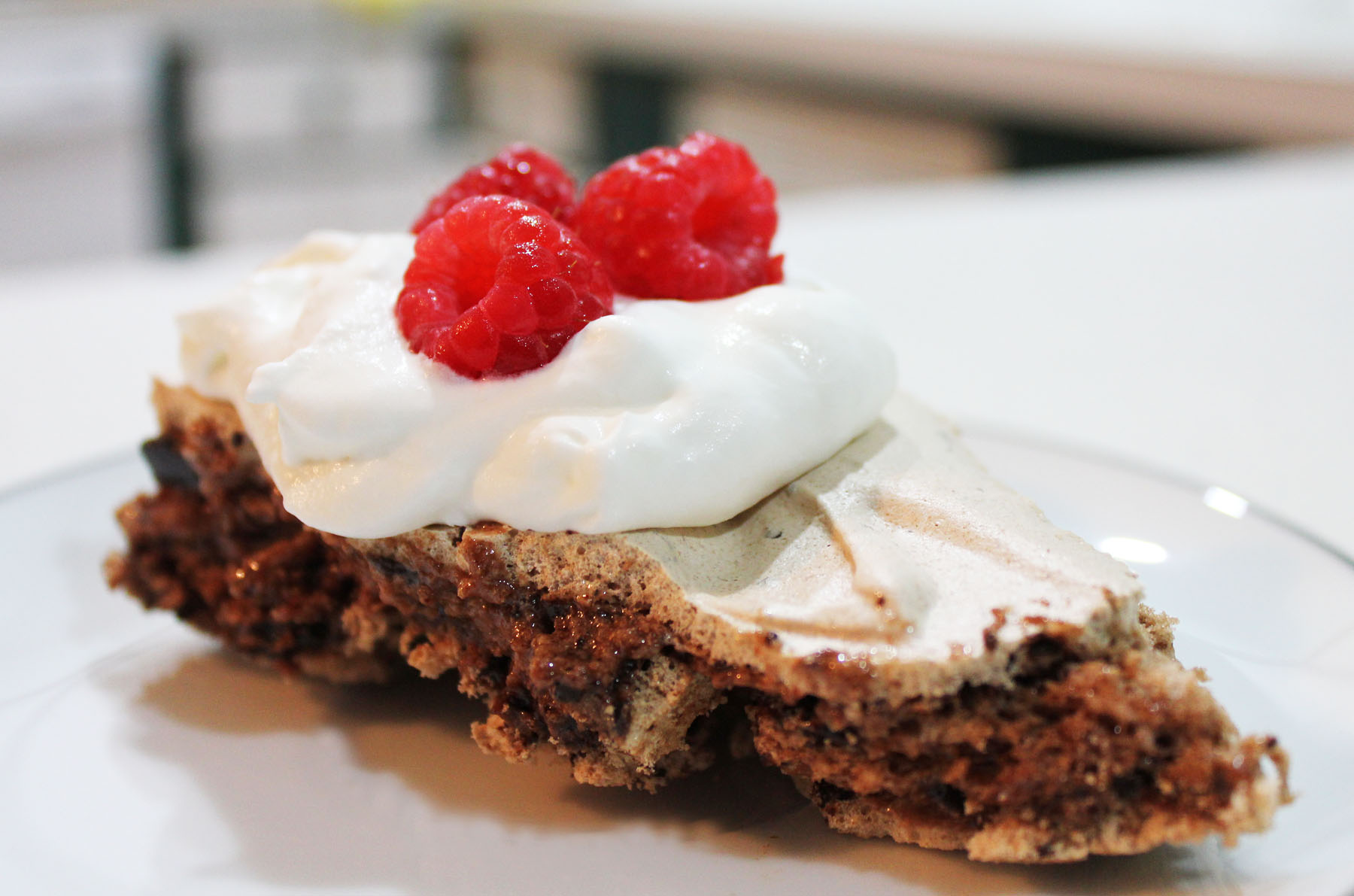 Turn off the oven, crack the door and let the chocolate meringue disk cool completely in the oven. When you’re ready to serve, invert onto a platter and peel off the parchment. I loaded ours up with whipped cream and fresh raspberries.