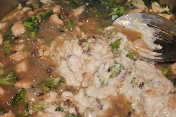 While the meatloaf is baking, pour two cups of chicken broth into a pan with butter. You can add a spoon of crushed garlic if you want, which we didn’t. This is going to cook for about twenty minutes, until it starts to thicken (although it will still be thin, not like gravy).
