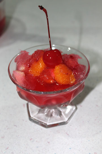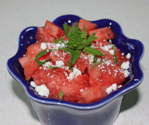 Layer lettuce, tomato slices, olives and cucumbers in a dish or bowl. If you want the cucumbers to look fancy, peel and then run a fork’s tines down the outside of it all around. It creates a nice pattern when they are sliced.