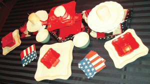 Use what you have – and add fun accents. Gather all your white, red and blue dishes then mix and match. Use a tablecloth in red, white or blue (or sheets work, too) create a fun centerpiece using dishes placed at different heights and presto! You’ve got a great looking table. If you don’t have pedestals or cake plates to use, create height by turning bowls upside down and putting plates on top. In the photo above, the only thing I purchased were the napkins (yes, I have a flag scarf and it comes in really handy as a table runner!).
