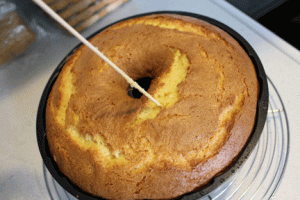 Bake for about 50 minutes, until cake starts to pull away from the sides of the pan and a toothpick inserted near the center comes out clean.