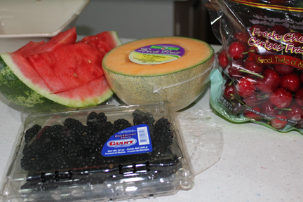 Ingredients included watermelon, canteloupe, cherries and blackberries but you could use whatever fruit you have on hand that is in season. You do need melon to do the butterfly cut-outs though.