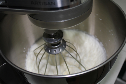Using a mixer, whip the cream with sugar and vanilla until peaks form. Set aside.
