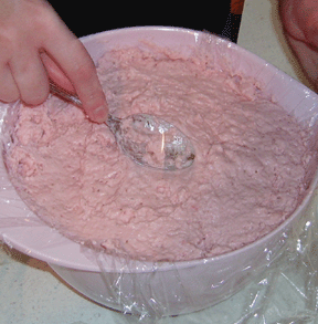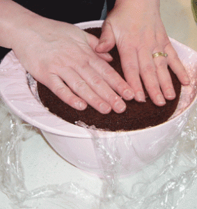 Plastic wrap the inside of the bowl and leave plenty hanging out. Yep, that is a pink bowl MWH bought me and I love it!