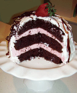 A peek inside the cake. Just look at all that yummy chocolate and strawberry sweet goodness.