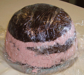 Gently press one cake layer into the bottom of the bowl. Spoon about one-half of the filling over the cake layer then top with another layer of cake. Spread remaining filling over the second layer of the cake; top with the third layer of cake. Gently press down. Cover with loose ends of plastic wrap and refrigerate at least one hour (you can refrigerate over night as well).