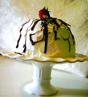 Frost with whipping cream, drizzle with chocolate frosting, top with butterflies and a berry. Ta-Da!