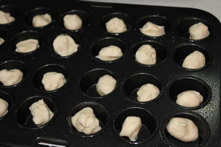 While the apples are cooking, you can start filling your mini-muffin cups with the chilled dough. Shape dough into balls about the size of walnuts.
