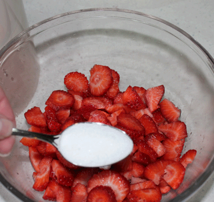 If you are using berries and they are not in season, you can bring out their flavor by slicing and sprinkling with sugar. Let rest at room temperature about 20 minutes. I’m fairly certain people think I am nuts when I purchase berries because if they don’t smell like berries, they aren’t going in my cart. Go ahead, sniff a carton and see how many strange looks you get over in the produce department.