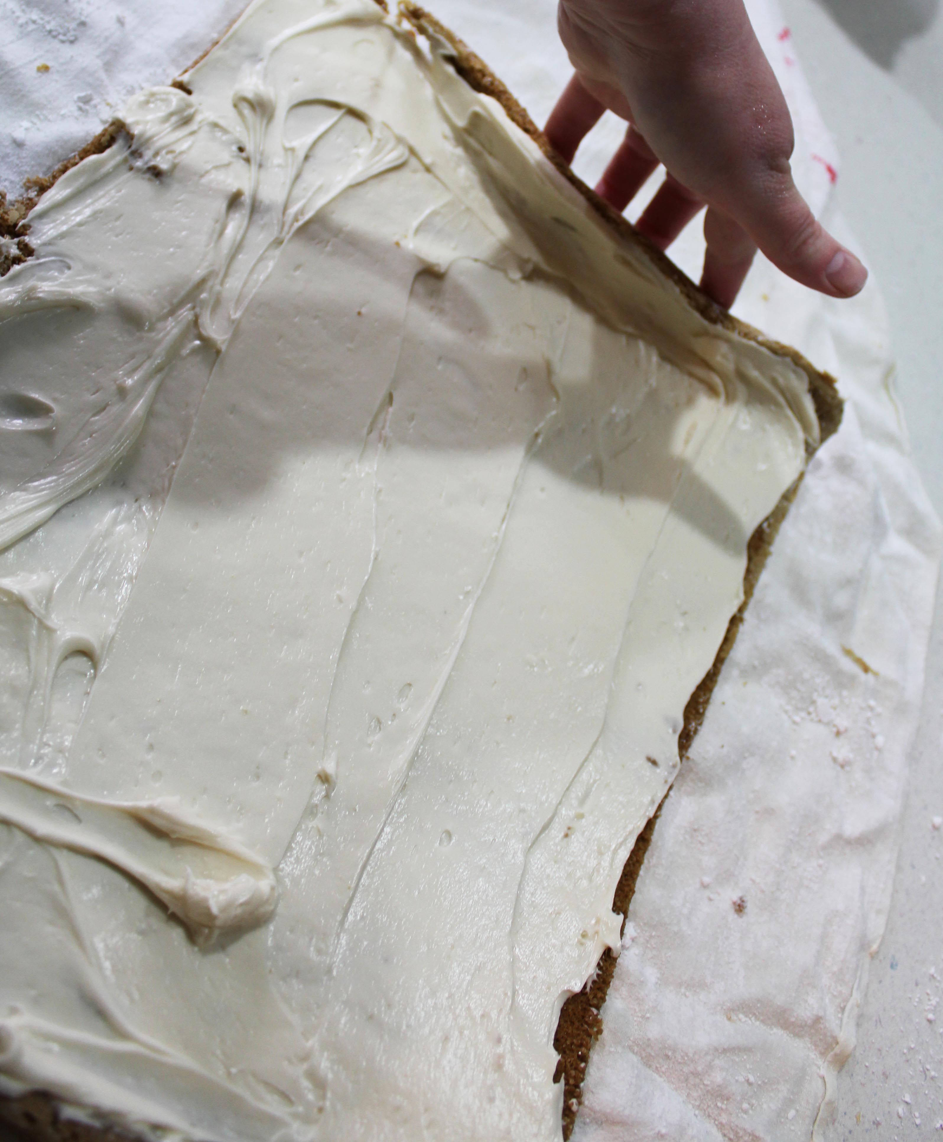 Once the cake is done, remove from oven and let cool completely. Spoon in half a can of frosting and mix well.