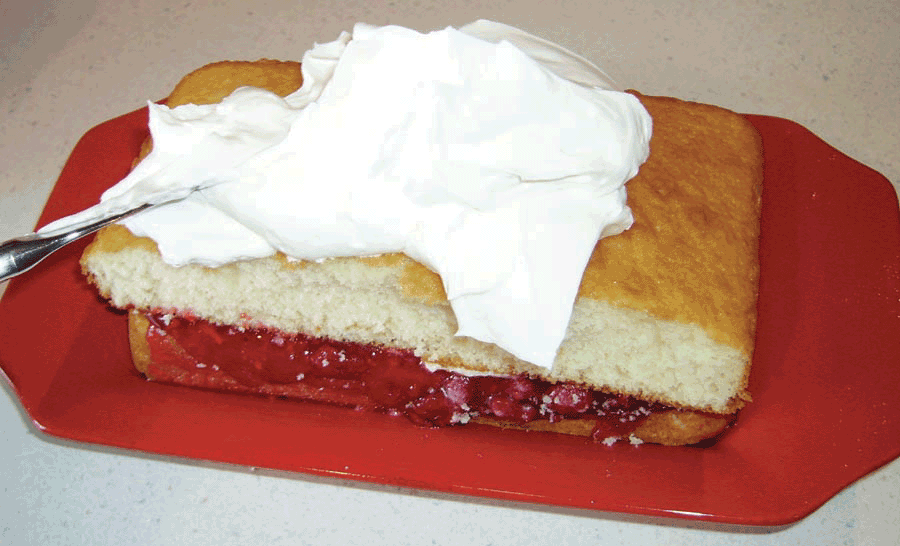 Generously cover cake with whipped cream.