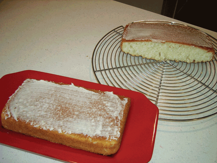 Now that the top layer is in place, get the whipping cream out of the fridge and liberally spread all over the cake. Feel free to be generous with the whipping cream.