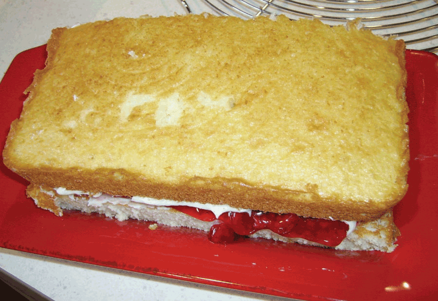 Place frosted second layer frosting side down on the filling. This way you have a frosting and filling sandwich.