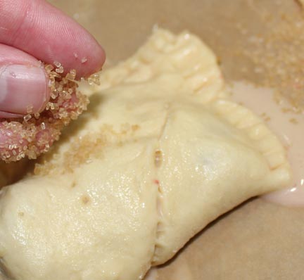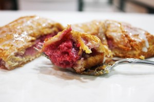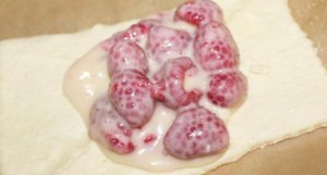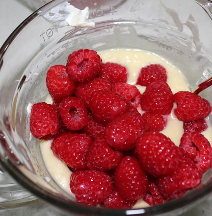While it is cooling, wash the raspberries and drain. In a small bowl, sprinkle 1 tbsp. sugar over the berries and let it soak in. Set aside.