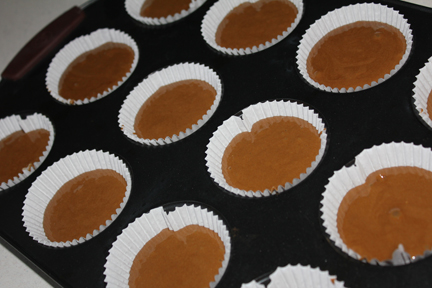 Pour into paper-lined muffin cups and bake at 350 degrees until the tops bounce back when touched (about 15 minutes or so).
