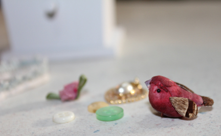 Next, I decided what trim I wanted to use. A few buttons, a little fabric rose, a piece of vintage trim and, of course, a little bird.