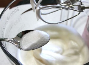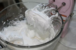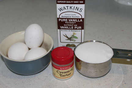Beat egg whites, add in vanilla and cream of tartar. Gradually beat in sugar and continue to beat until stiff and glossy.