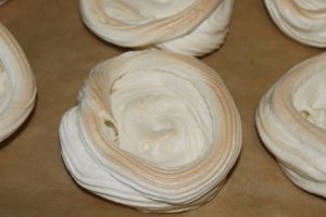 Drop eight mounds onto parchment paper-lined baking sheet. Shape into 3-in. cups with the back of a spoon. (Or pipe through a pastry bag.) Bake at 225° for 1 to 1-1/2 hours or until set and dry. Turn oven off; leave meringues in oven for 1 hour.
