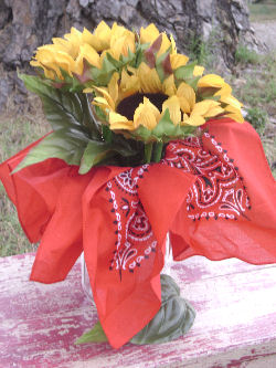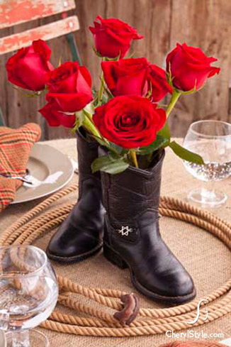 Plan an outdoor party. If you have access to a barn or covered building, even better. Make sure you have country music playing in the background. Use straw bales for seating and sawhorse tables. Fill canning jars with sunflowers or wildflowers and tie with a raffia bow. Use bandanas to tie bows or drape along tables. Have extras to give to guests who need a little umph to their costume. If you have western tack or can borrow some, use bridles, saddles and boots as props to create a more authentic feel to your party setting. Old boots also make fun centerpieces when you put a vase inside with flowers. Make sure you have lots of fun lighting. Use battery-operated candles in punched out tin cans for great accents. You could also use some roping and string cans with lights across entries or over tables. A word of caution – if you are using straw for seating or decorations at your party please refrain from using anything with an open flame. It catches fire very quickly and the last thing you want is to have the fire department have to show up at your party.